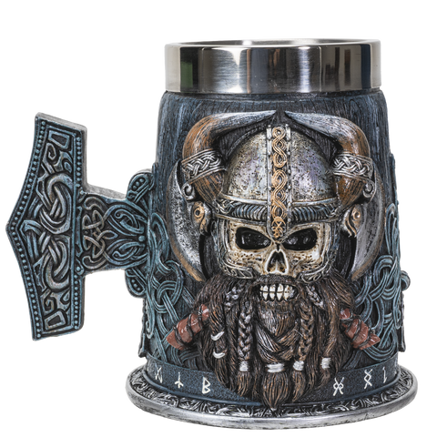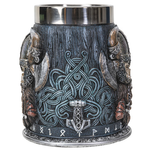 Cast in designer resin and hand-painted, the black body of this Tankard is seemingly made of carved wood, intertwining Viking knots covering the lower half. A ring of Nordic runes circles the base, and the knot designs extend to the handle – shaped like Mjolnir.
