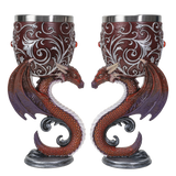 Sold as a set of 2, these double dragon goblets are adorned with intricate silver baroque detailing rising from the dragon's base to the stainless-steel rim. They are the perfect addition to any Fantasy and Gothic collection