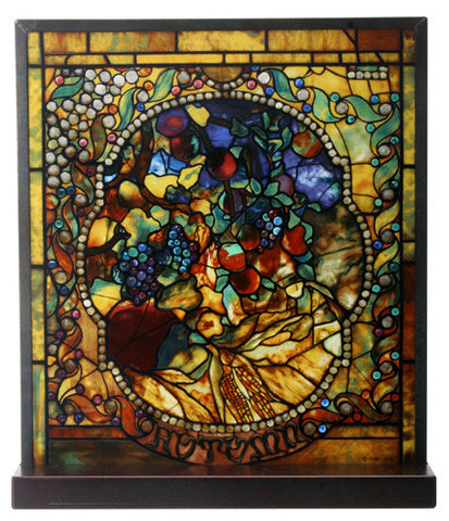 At the 1900 Exposition Universelle in Paris, Louis Comfort Tiffany (1848–1933) debuted a magnificent window depicting the four seasons. The Autumn panel, showing the bounty of a fall harvest, is just one part of Tiffany’s extraordinary representation of nature’s cycle. In it, golden corn glistens in the sun and ripe fruits in rich purples and reds hang heavy from the vine.